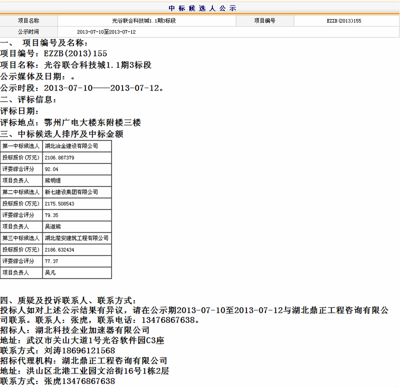 光谷聯(lián)合科技城1.1期3標(biāo)中標(biāo)候選人公示