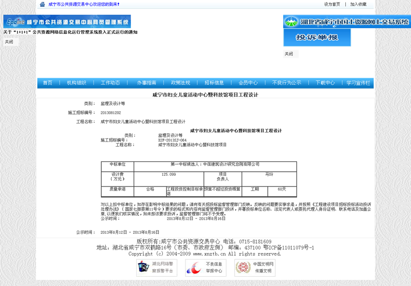 咸寧市婦女兒童活動中心暨科技館項目工程設計中標通知