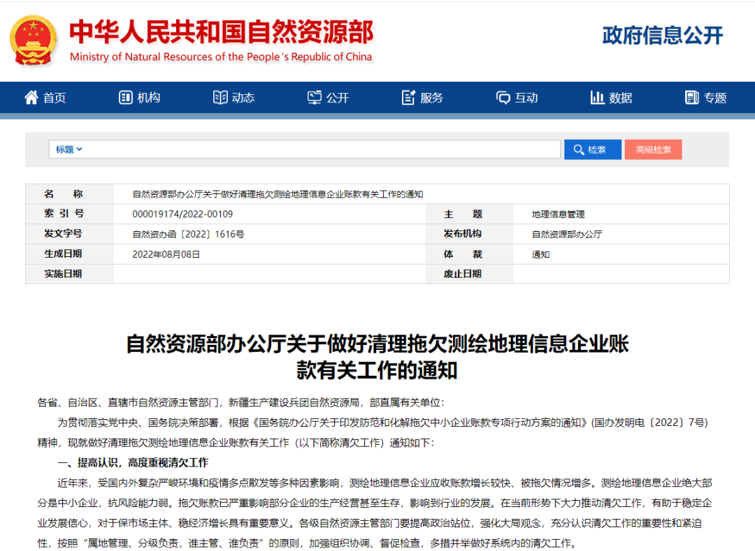8月22日,自然資源部官網(wǎng)發(fā)布了《自然資源部辦公廳關(guān)于做好清理拖欠測繪地理信息企業(yè)賬款有關(guān)工作的通知》(自然資辦函〔2022〕1616號),部署做好清理拖欠測繪地理信息企業(yè)賬款有關(guān)工作。