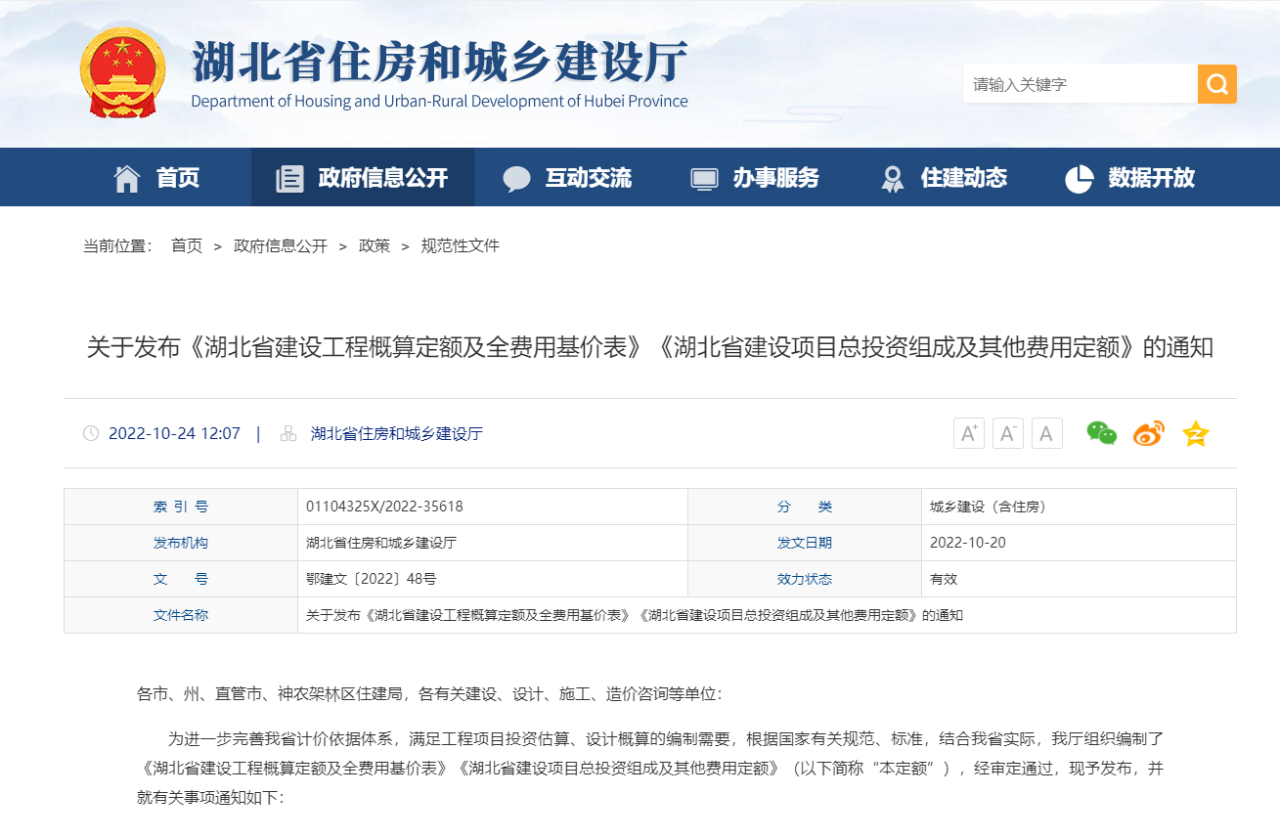 湖北省住建廳發布《湖北省建設工程概算定額及全費用基價表》《湖北省建設項目總投資組成及其他費用定額》的通知