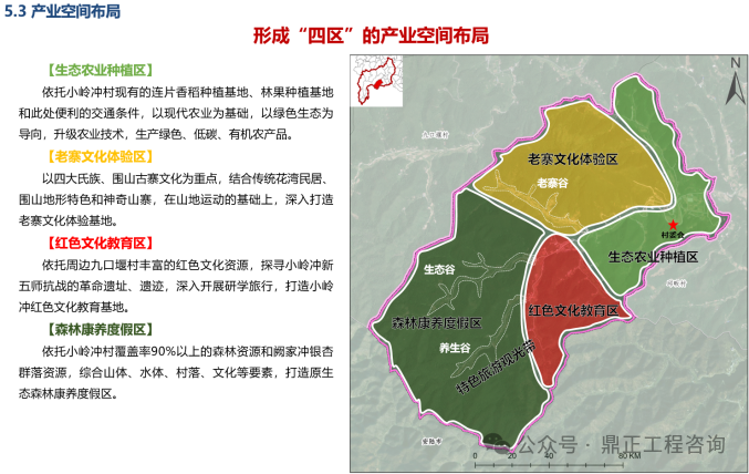 其中,雙河村通過發揮特色農業產業優勢建設農業品牌,延伸農業加工產業鏈開啟創收新征程,積極發展鄉村休閑業打造詩意田園水鄉,主要打造田園綜合體、濱河休閑體驗,拓展農業休閑旅游業態。泉水寺村重點結合國家級專用汽車和應急裝備檢測研發基地的建設基礎,構建以產業基地配套服務為主導,以生態種養、休閑農業為特色的產業體系。小嶺沖村重點整合“綠(自然山水)、古(晚清古寨)、金(千年銀杏)、紅(紅色文化)”四色資源,構建“綠+古+金+紅”四色產業,打造品質活力鄉村旅游。九口堰村重點以豐富的紅色文化、自然資源為基礎,以紅色文化體驗為主導產業,以文化帶動旅游,拓展紅色體驗、康養度假等產業,打造全國紅色教育示范基地。