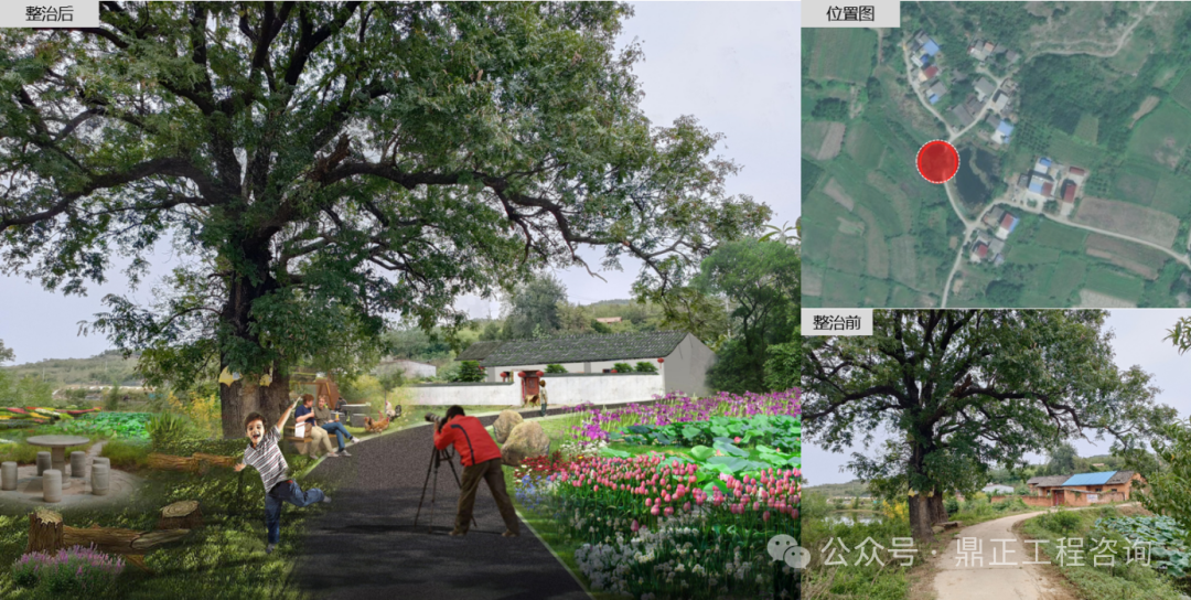 九口堰村入口空間,通過清理道路臟亂雜物,保留并完善修復破損路面;清理道路兩側雜草,梳理林下空間,沿線可播撒草籽,營造整齊干凈的鄉野景觀;結合九口堰村特色的古銀杏資源、香菇產業以及地方特色,于村口增設景墻,形成村莊入口標志;路邊環境梳理,通過木樁作為空間分界物,植栽時令花卉,作為背景點綴。