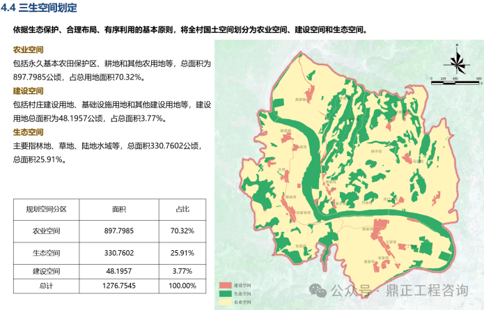 如雙河村結合“田、宅、水、林、產、景”等要素優化用地結構,集約土地利用,全要素管控。落實上位空間管控、堅持農業生態優先、劃定底線保護控制線。依據生態保護、合理布局、有序利用的基本原則,將全村國土空間劃分為農業空間、建設空間和生態空間,明確生態保護、農業生產、村莊建設的主要區域。同時,對三類空間制定管控要求,強化村莊的底線管控。